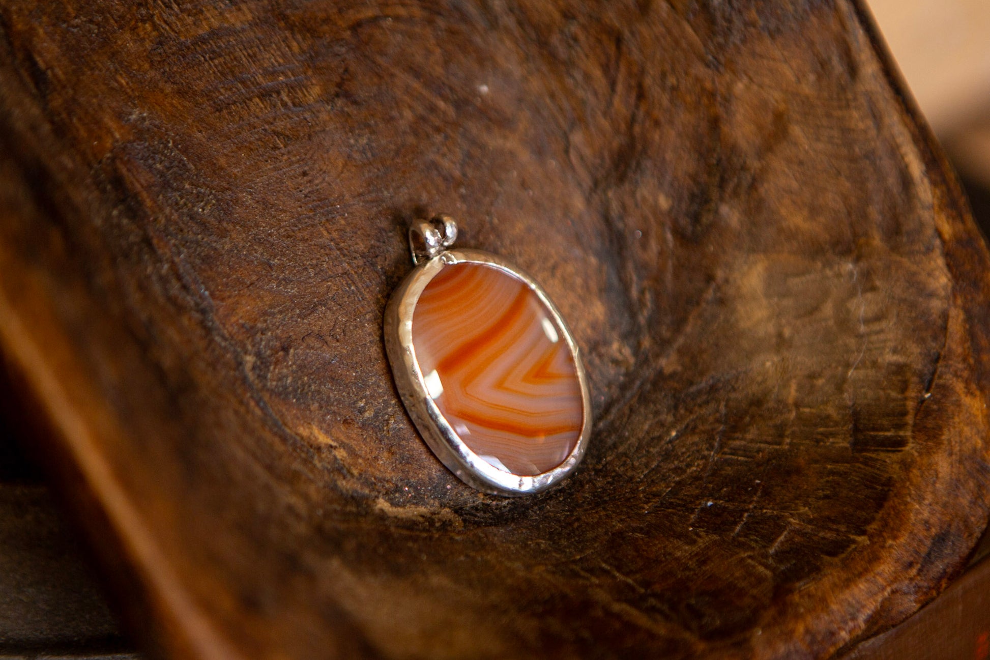 At its center is a genuine banded agate, marked with warm caramel and cream lines formed slowly by nature. The stone is set in an open-back sterling silver bezel, allowing light to pass through and highlight the agate’s natural depth and movement.
